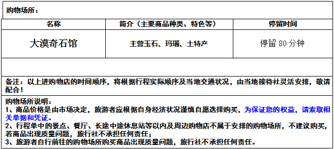 7、提前说明:景区、酒店、服务区、停车场等各种购物场所是其相关的配套设施,属于该单位自行商业行为,不属于旅行社安排的购物商店,游客可自主选择,旅行社不承担相关责任。