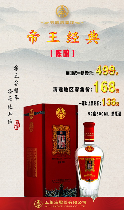 五粮液帝王经典-陈酿,全国统一零售价499元/瓶 ,清远地区试喝价168元/瓶 52度500ml 单瓶装.